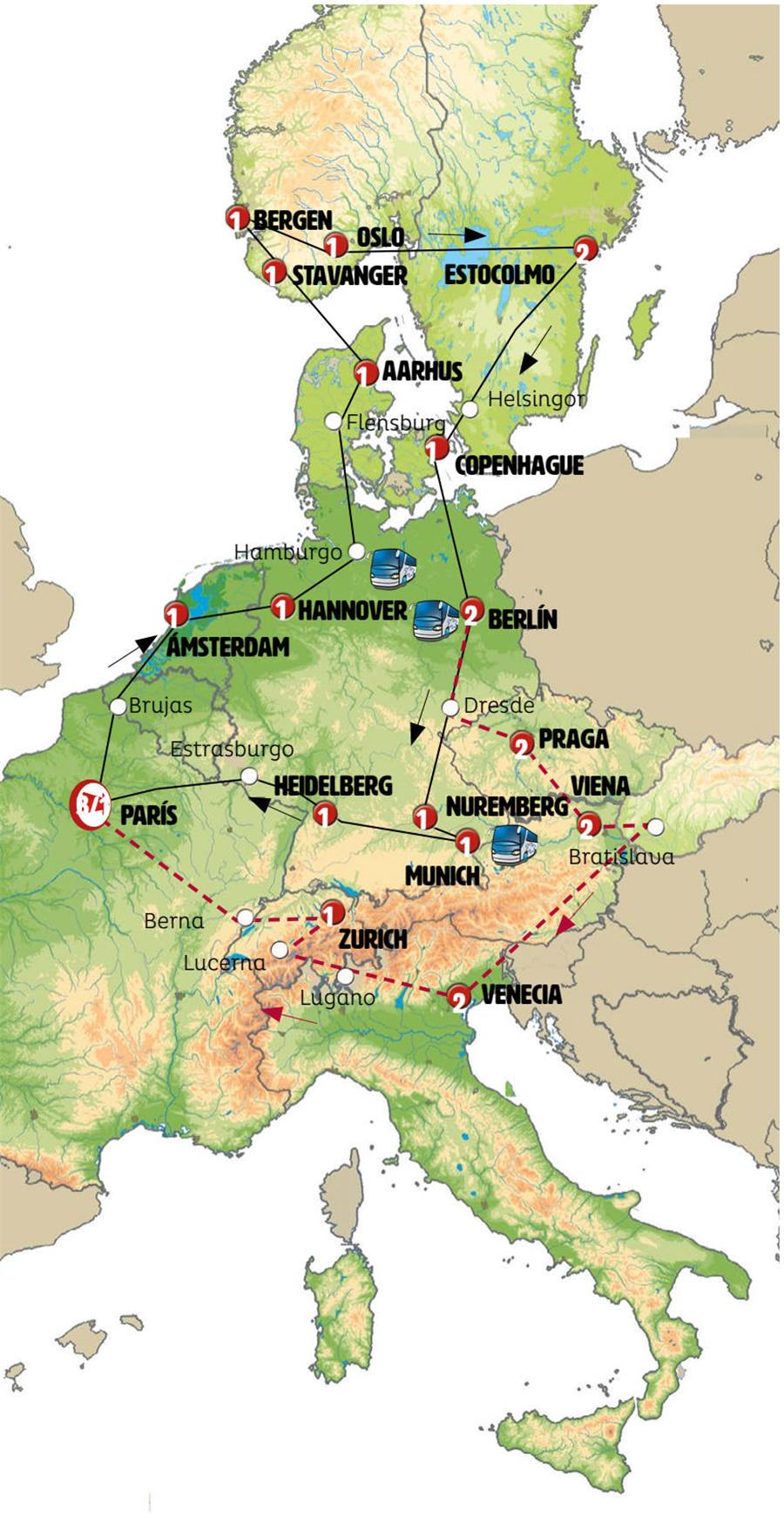 Disfruta de un recorrido grupal en autobús con guía en español durante 23 días, visitando 30 ciudades. Incluye alojamiento en hoteles y desayunos diarios. Turismo guiado por PARÍS, BRUJAS, ÁMSTERDAM, HANNOVER, HAMBURGO, FLENSBURG, AARHUS, FERRI KRISTIANSAND, KRISTIANSAND, STAVANGER, BERGEN, FIORDO DE SOGN, OSLO, OREBRO, ESTOCOLMO, ELSINOR, COPENHAGUE, BERLÍN, DRESDE, PRAGA, CESKÉ BUDEJOVICE, CESKY KRUMLOV, VIENA, MARIBOR, LIUBLIANA, VENECIA, LUGANO, LUCERNA, ZÚRICH, ESTRASBURGO.