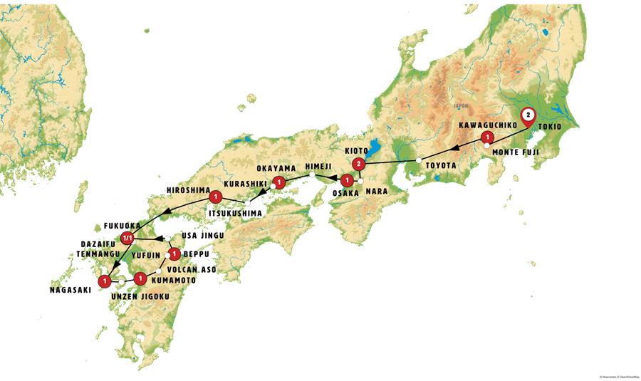 Disfruta de un recorrido grupal en autobús con guía en español durante 14 días, visitando 23 ciudades. Incluye alojamiento en hoteles y desayunos diarios. Turismo guiado por TOKIO, MONTE FUJI, KAWAGUCHIKO, IYASHI-NO-SATO NENBA, TOYOTA, KIOTO, NARA, OSAKA, HIMEJI, JARDINES DE KORAKUEN, OKAYAMA, KURASHIKI, ITSUKUSHIMA, HIROSHIMA, FUKUOKA, DAZAIFU TENMANGU, NAGASAKI, UNZEN JIGOKU, KUMAMOTO, VOLCAN ASO, YUFUIN, BEPPU, USA JINGU.