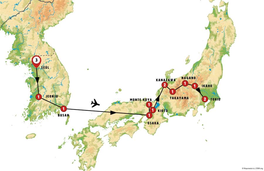 SEÚL, SUWON, JEONJU, DAMYANG, HAEINSA, BUSAN, OSAKA, MONTE KOYA, KIOTO, EIHEI-JI, KATSUYAMA-MUSEO DE LOS DINOSAURIOS, KATSUYAMA, KANAZAWA, AINOKURA, SHIRAKAWAGO, ALDEA DE HIDA, TAKAYAMA, HIDA FURUKAWA, MATSUMOTO, NAGANO, PARQUE DE LOS MONOS, KUSATSU, IKAHO, NIKKO, TOKIO