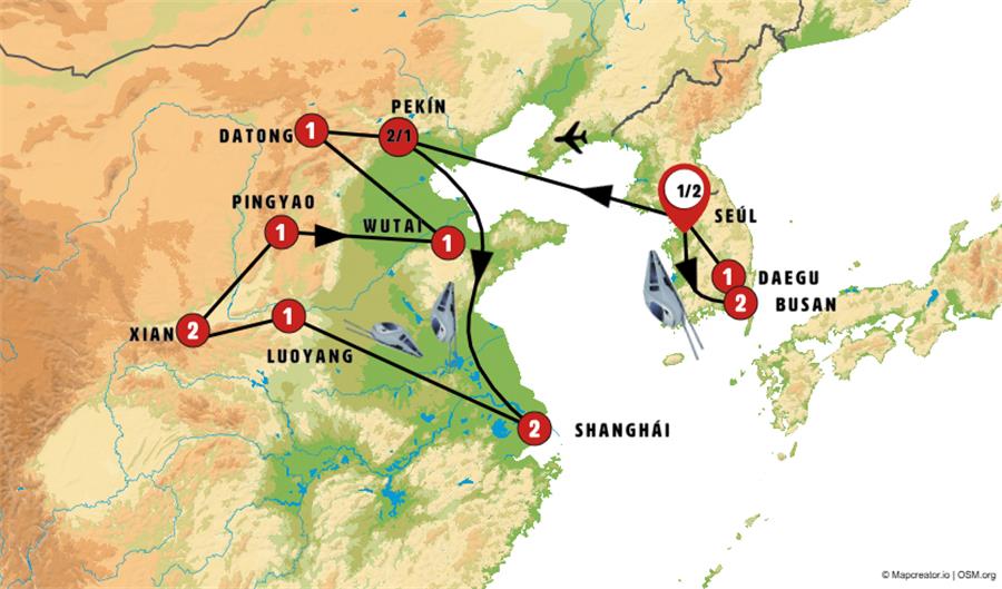 SEÚL, BUSAN, SEOKGURAM, BULGUKSA, GYEONGJU, DAEGU, ANDONG, HAHOE, PEKÍN, SHANGHÁI, LUOYANG, LONGMEN, SANMENXIA, XIAN, LINFEN, MANSIÓN CLAN WANG, PINGYAO, WUTAI, YANMENGUAN, YINGXIAN, TEMPLO COLGANTE, DATONG, JIMING POST