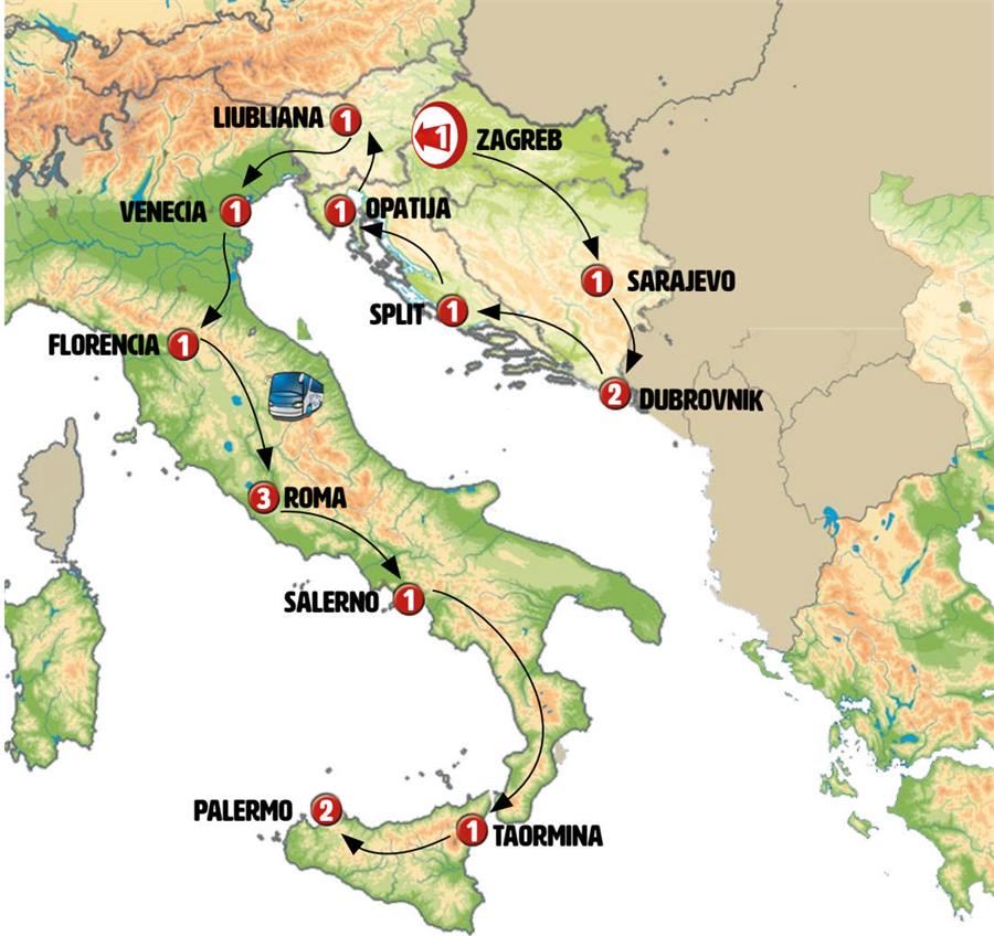 ZAGREB, BANIA LUKA, JAJCE, SARAJEVO, MOSTAR, DUBROVNIK, STON, SPLIT, PLITVICE, OPATIJA, POSTOJNA, BLED, LIUBLIANA, VENECIA, FLORENCIA, ROMA, NÁPOLES, CAPRI, SORRENTO, SALERNO, PAOLA, MESINA, TAORMINA, GIARDINI NAXOS, VILLA ROMANA DEL CASALE, PALERMO