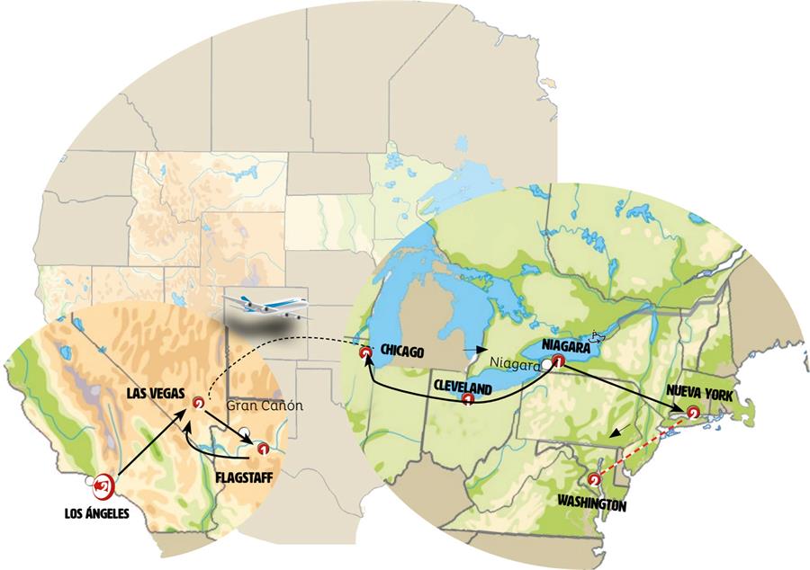 LOS ÁNGELES, LAS VEGAS, CAÑÓN DEL COLORADO, FLAGSTAFF, CHICAGO, CLEVELAND, CATARATAS DEL NIÁGARA, CORNING, NUEVA YORK, FILADELFIA, WASHINGTON