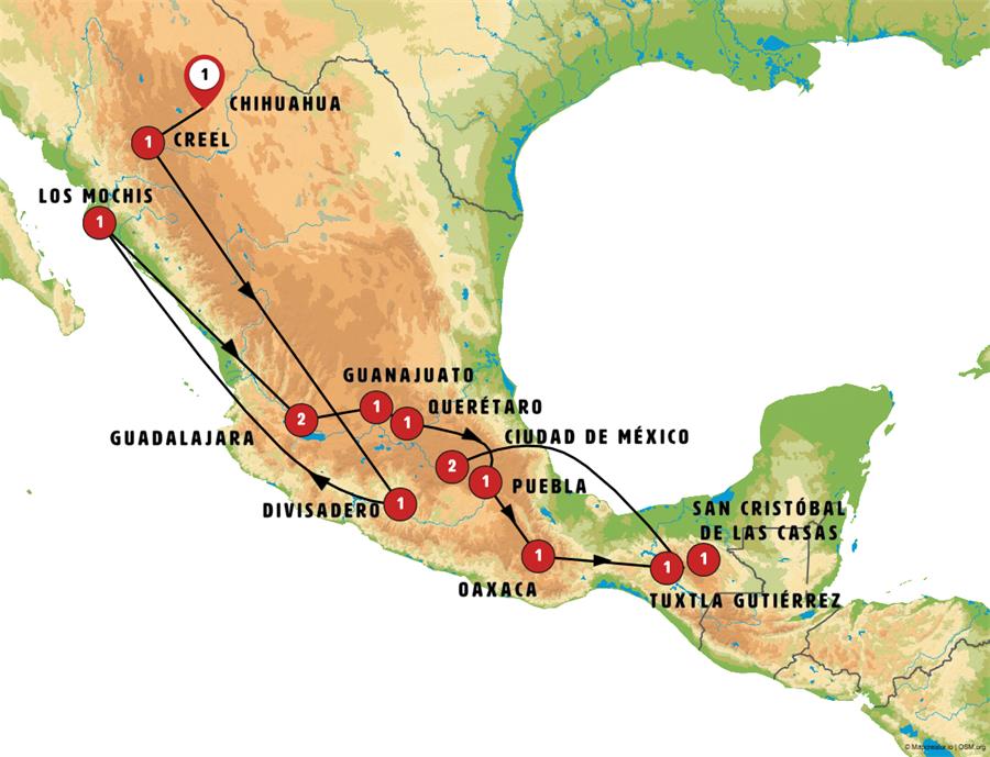 Disfruta de un recorrido grupal en autobús con guía en español durante 15 días, visitando 21 ciudades. Incluye alojamiento en hoteles y desayunos diarios. Turismo guiado por CHIHUAHUA, CREEL, DIVISADERO, CHEPE EXPRESS, LOS MOCHIS, GUADALAJARA, GUANAJUATO, DOLORES HIDALGO, SAN MIGUEL DE ALLENDE, QUERÉTARO, TULA, PUEBLA, OAXACA, SAN PABLO VILLA DE MITLA, TUXTLA GUTIÉRREZ, CAÑÓN DEL SUMIDERO, CHIAPA DE CORZO, ZINACANTÁN, SAN JUAN DE CHAMULA, SAN CRISTÓBAL DE LAS CASAS, CIUDAD DE MÉXICO.