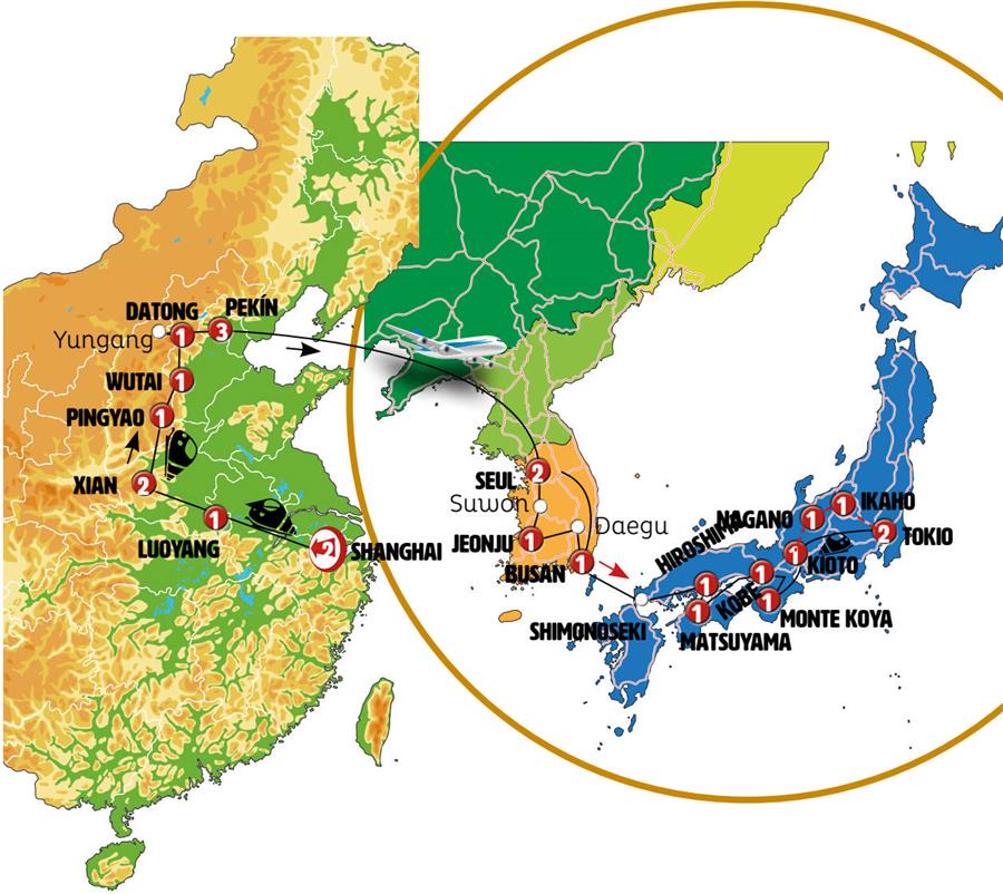 Disfruta de un recorrido grupal en autobús con guía en español durante 26 días, visitando 41 ciudades. Incluye alojamiento en hoteles y desayunos diarios. Turismo guiado por SHANGHÁI, LUOYANG, LONGMEN, SANMENXIA, XIAN, LINFEN, MANSIÓN CLAN WANG, PINGYAO, WUTAI, YANMENGUAN, YINGXIAN, TEMPLO COLGANTE, DATONG, JIMING POST, PEKÍN, SEÚL, SUWON, JEONJU, DAMYANG, HAEINSA, BUSAN, FUKUOKA, IWAKUNI, ITSUKUSHIMA, HIROSHIMA, MATSUYAMA, KOTOHIRA, TAKAMATSU, NARUTO, KOBE, OSAKA, MONTE KOYA, KIOTO, TSUMAGO, MATSUMOTO, NAGANO, PARQUE DE LOS MONOS, KUSATSU, IKAHO, NIKKO, TOKIO.
