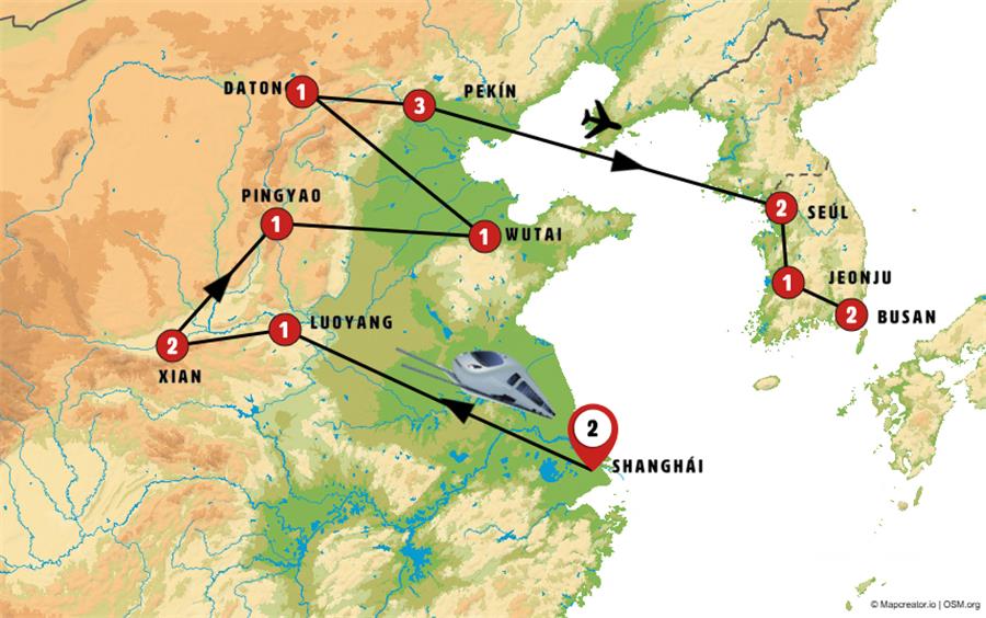 Disfruta de un recorrido grupal en autobús con guía en español durante 17 días, visitando 21 ciudades. Incluye alojamiento en hoteles y desayunos diarios. Turismo guiado por SHANGHÁI, LUOYANG, LONGMEN, SANMENXIA, XIAN, LINFEN, MANSIÓN CLAN WANG, PINGYAO, WUTAI, YANMENGUAN, YINGXIAN, TEMPLO COLGANTE, DATONG, JIMING POST, PEKÍN, SEÚL, SUWON, JEONJU, DAMYANG, HAEINSA, BUSAN.