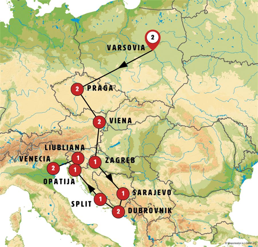 VARSOVIA, WROCLAW, PRAGA, CESKÉ BUDEJOVICE, CESKY KRUMLOV, VIENA, MARIBOR, ZAGREB, BANIA LUKA, JAJCE, SARAJEVO, MOSTAR, DUBROVNIK, STON, SPLIT, PLITVICE, OPATIJA, POSTOJNA, BLED, LIUBLIANA, VENECIA