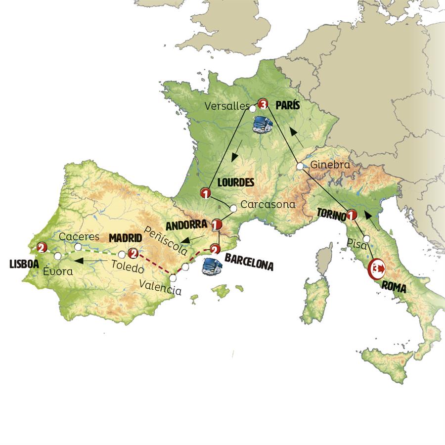 Disfruta de un recorrido grupal en autobús con guía en español durante 25 días, visitando 30 ciudades. Incluye alojamiento en hoteles y desayunos diarios. Turismo guiado por LISBOA, CÁCERES, MADRID, ZARAGOZA, BARCELONA, COSTA AZUL, MÓNACO, GÉNOVA, VENECIA, FLORENCIA, ROMA, PISA, TURÍN, GINEBRA, PARÍS, CANTERBURY, LONDRES, CANAL DE LA MANCHA, BRUJAS, GANTE, MIDDELBURG, ROTTERDAM, ÁMSTERDAM, KINDERDIJK, BRUSELAS, BLOIS, TOURS, BURDEOS, SAN SEBASTIÁN, ÁREA DE SERVICIO FORONDA.