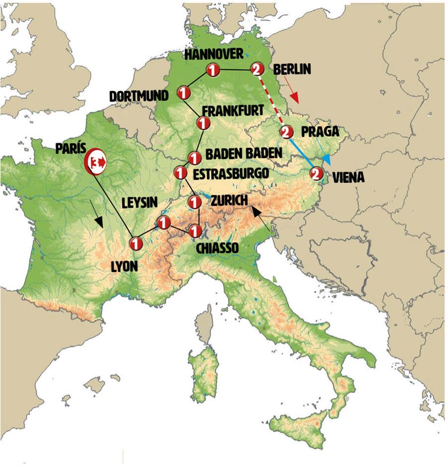 Disfruta de un recorrido grupal en autobús con guía en español durante 17 días, visitando 36 ciudades. Incluye alojamiento en hoteles y desayunos diarios. Turismo guiado por PARÍS, BORGOÑA, BEAUNE, LYON, GINEBRA, LAUSANA, GRUYERES, FRIBURGO, INTERLAKEN, AARESCHLUCHT, LUGANO, CHIASSO, BELLINZONA, ALTDORF, LUCERNA, ZÚRICH, BASILEA, COLMAR, RIQUEWIHR, ESTRASBURGO, FRIBURGO DE BRISGOVIA, TRIBERG, GENGENBACH, BADEN-BADEN, ESPIRA, HEIDELBERG, FRANKFURT, CRUCERO POR EL RIN, COLONIA, DORTMUND, RUTA DE LOS CUENTOS DE HADAS, HANNOVER, GOSLAR, BERLÍN, DRESDE, PRAGA.