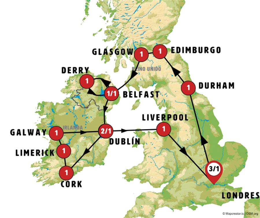 LONDRES, CAMBRIDGE, YORK, DURHAM, ALNWICK, EDIMBURGO, INVERNESS, LAGO NESS, FORT AUGUSTUS, GLASGOW, BELFAST, CUSHENDUN, BALLYCASTLE, CALZADA DEL GIGANTE, DERRY, DONEGAL, MARBLE ARCH, CASTILLO DE HILLSBOROUGH, DUBLÍN, POWERSCOURT, KILKENNY, CASHEL, CORK, KINSALE, KILLARNEY, LIMERICK, ACANTILADOS DE MOHER, GALWAY, CLONMACNOISE, CAERNARFON, LIVERPOOL, STRATFORD, OXFORD