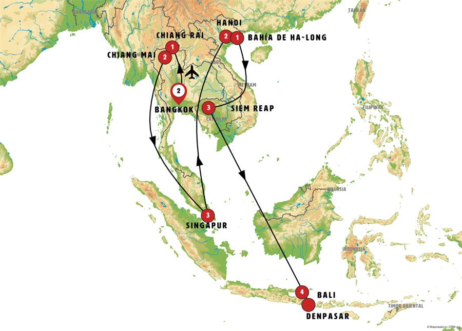 Disfruta de un recorrido grupal en autobús con guía en español durante 19 días, visitando 9 ciudades. Incluye alojamiento en hoteles y desayunos diarios. Turismo guiado por BANGKOK, CHIANG RAI, CHIANG MAI, SINGAPUR, HANOI, BAHÍA DE HA-LONG, SIEM REAP, DENPASAR, BALI.