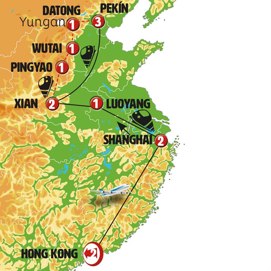 Disfruta de un recorrido grupal en autobús con guía en español durante 14 días, visitando 16 ciudades. Incluye alojamiento en hoteles y desayunos diarios. Turismo guiado por HONG KONG, SHANGHÁI, LUOYANG, LONGMEN, SANMENXIA, XIAN, LINFEN, MANSIÓN CLAN WANG, PINGYAO, WUTAI, YANMENGUAN, YINGXIAN, TEMPLO COLGANTE, DATONG, JIMING POST, PEKÍN.
