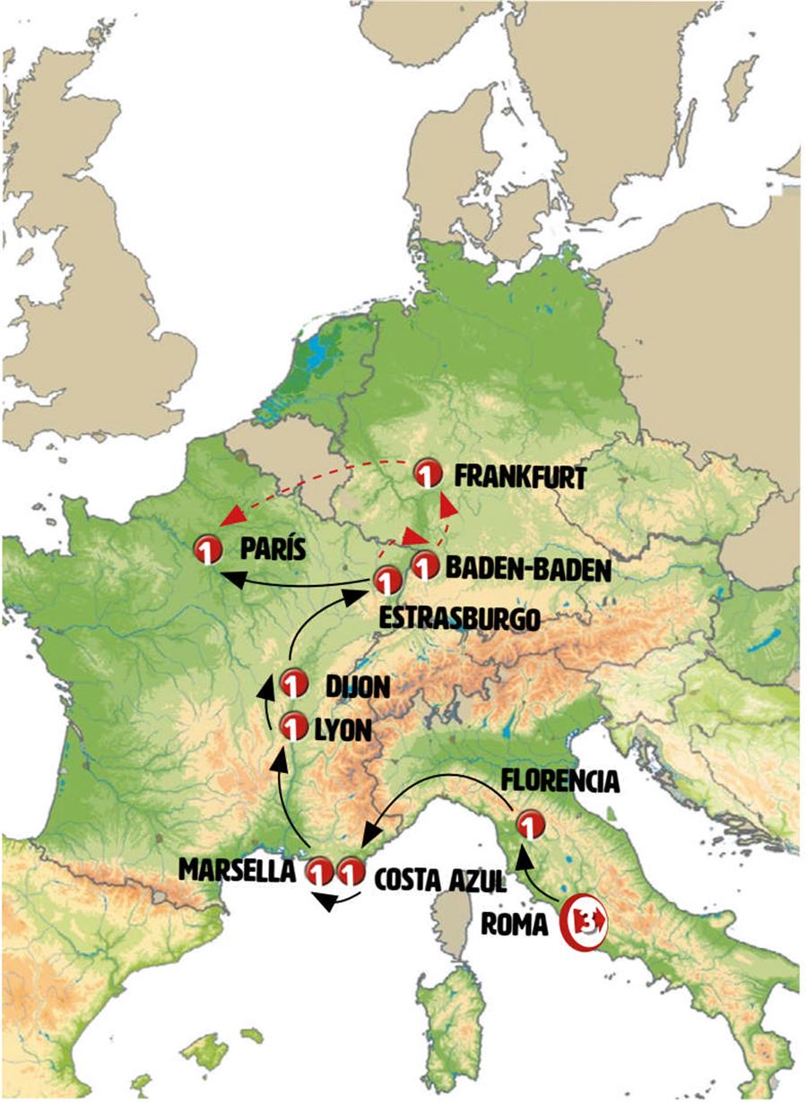Disfruta de un recorrido grupal en autobús con guía en español durante 13 días, visitando 30 ciudades. Incluye alojamiento en hoteles y desayunos diarios. Turismo guiado por ROMA, FLORENCIA, PISA, SESTRI LEVANTE, MONTECARLO, COSTA AZUL, SAINTE-MAXIME, SAINT-TROPEZ, MARSELLA, ARLES, AVIGNON, LYON, TOURNUS, CASTILLO DE SAVIGNY, BEAUNE, DIJON, BESANZÓN, COLMAR, RIQUEWIHR, ESTRASBURGO, FRIBURGO DE BRISGOVIA, TRIBERG, GENGENBACH, BADEN-BADEN, ESPIRA, HEIDELBERG, FRANKFURT, LUXEMBURGO, REIMS, PARÍS.