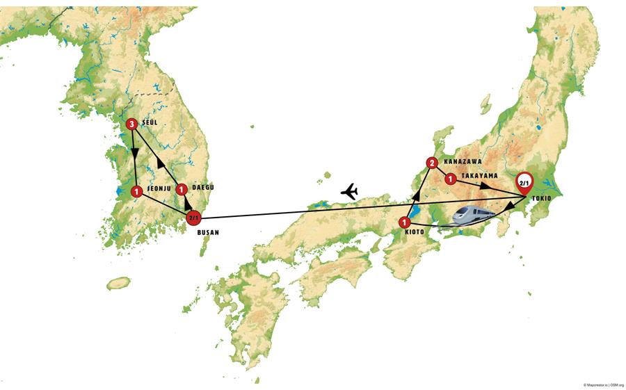 TOKIO, KIOTO, EIHEI-JI, KATSUYAMA-MUSEO DE LOS DINOSAURIOS, KATSUYAMA, KANAZAWA, AINOKURA, SHIRAKAWAGO, ALDEA DE HIDA, TAKAYAMA, HIDA FURUKAWA, MATSUMOTO, BUSAN, SEOKGURAM, BULGUKSA, GYEONGJU, DAEGU, ANDONG, HAHOE, SEÚL, SUWON, JEONJU, DAMYANG, HAEINSA