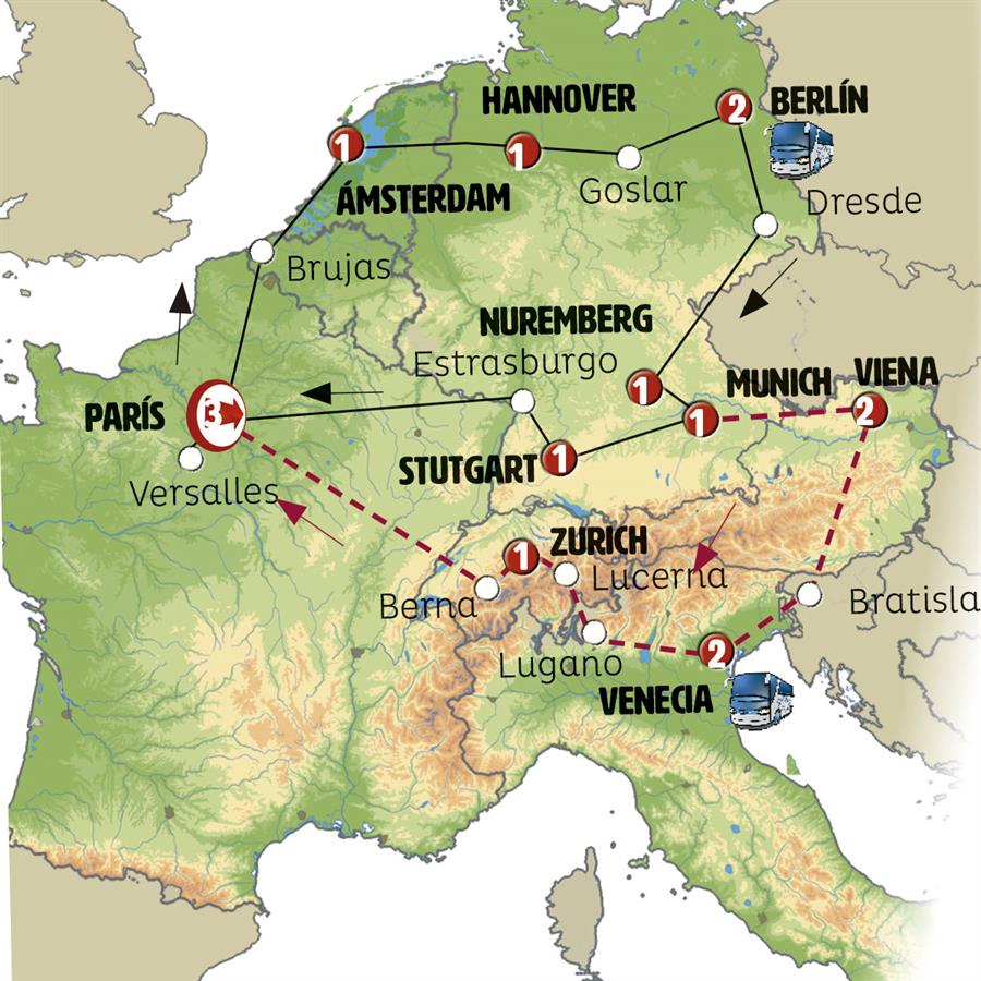 Disfruta de un recorrido grupal en autobús con guía en español durante 15 días, visitando 23 ciudades. Incluye alojamiento en hoteles y desayunos diarios. Turismo guiado por PARÍS, BRUJAS, ÁMSTERDAM, HANNOVER, GOSLAR, BERLÍN, DRESDE, BAMBERG, NUREMBERG, KLOSTER WELTENBURG, DACHAU, MÚNICH, SALZBURGO, ST. WOLFGANG, LAGO TRAUNSEE, VIENA, BRATISLAVA, REGIÓN DE CARINTIA, VENECIA, LUGANO, LUCERNA, ZÚRICH, ESTRASBURGO.