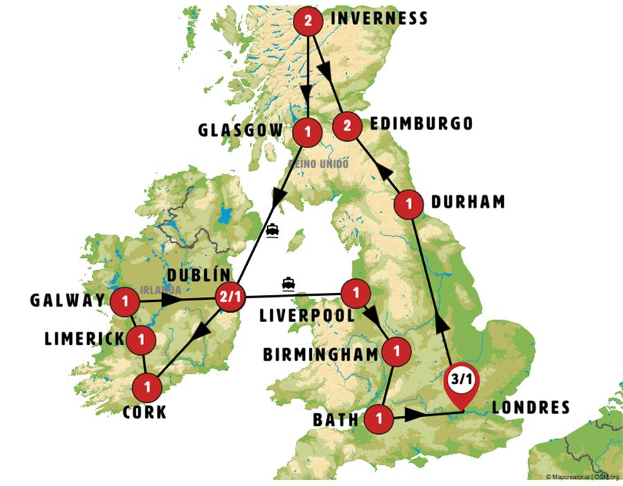 LONDRES, CAMBRIDGE, YORK, DURHAM, ALNWICK, EDIMBURGO, LOS KELPIES, STIRLING, PITLOCHRY, CULLODEN, INVERNESS, FORT WILLIAM, INVERARAY, LAGO LOMOND, GLASGOW, BELFAST, DUBLÍN, POWERSCOURT, KILKENNY, CASHEL, CORK, KINSALE, KILLARNEY, LIMERICK, ACANTILADOS DE MOHER, GALWAY, CLONMACNOISE, CAERNARFON, LIVERPOOL, CHESTER, LICHFIELD, BIRMINGHAM, STRATFORD, STOW-ON-THE-WOLD, GLOUCESTER, BATH, STONEHENGE, SALISBURY