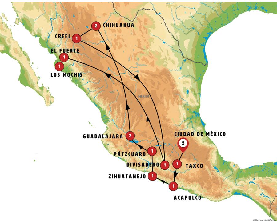 Disfruta de un recorrido grupal en autobús con guía en español durante 15 días, visitando 17 ciudades. Incluye alojamiento en hoteles y desayunos diarios. Turismo guiado por CIUDAD DE MÉXICO, TEPOZTLAN, CUERNAVACA, TAXCO, ACAPULCO, ZIHUATANEJO, JANITZIO, PÁTZCUARO, MORELIA, TLAQUEPAQUE, GUADALAJARA, CHIHUAHUA, CREEL, DIVISADERO, CHEPE EXPRESS, EL FUERTE, LOS MOCHIS.