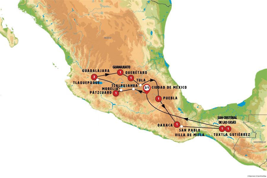 Disfruta de un recorrido grupal en autobús con guía en español durante 13 días, visitando 21 ciudades. Incluye alojamiento en hoteles y desayunos diarios. Turismo guiado por CIUDAD DE MÉXICO, MINA DE LAS DOS ESTRELLAS, TLALPUJAHUA, PÁTZCUARO, MORELIA, TLAQUEPAQUE, GUADALAJARA, GUANAJUATO, DOLORES HIDALGO, SAN MIGUEL DE ALLENDE, QUERÉTARO, TULA, PUEBLA, OAXACA, SAN PABLO VILLA DE MITLA, TUXTLA GUTIÉRREZ, CAÑÓN DEL SUMIDERO, CHIAPA DE CORZO, ZINACANTÁN, SAN JUAN DE CHAMULA, SAN CRISTÓBAL DE LAS CASAS.