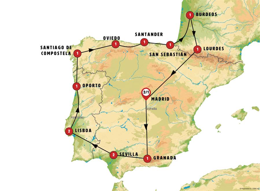 MADRID, GRANADA, NERJA, MÁLAGA, RONDA, SEVILLA, MÉRIDA, ÉVORA, LISBOA, FÁTIMA, OPORTO, SANTUARIO DEL BOM JESUS, CAMBADOS, SANTIAGO DE COMPOSTELA, LUGO, O CEBREIRO, LEÓN, OVIEDO, COVADONGA, SANTILLANA DEL MAR, SANTANDER, BILBAO, GUERNICA, SAN SEBASTIÁN, BURDEOS, LOURDES, SALLENT DE GALLEGO, ZARAGOZA