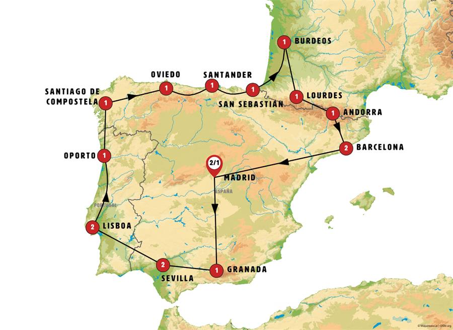 MADRID, GRANADA, NERJA, MÁLAGA, RONDA, SEVILLA, MÉRIDA, ÉVORA, LISBOA, FÁTIMA, OPORTO, SANTUARIO DEL BOM JESUS, CAMBADOS, SANTIAGO DE COMPOSTELA, LUGO, O CEBREIRO, LEÓN, OVIEDO, COVADONGA, SANTILLANA DEL MAR, SANTANDER, BILBAO, GUERNICA, SAN SEBASTIÁN, BURDEOS, LOURDES, CARCASONA, FOIX, ANDORRA, MONTSERRAT, BARCELONA, PEÑÍSCOLA, VALENCIA