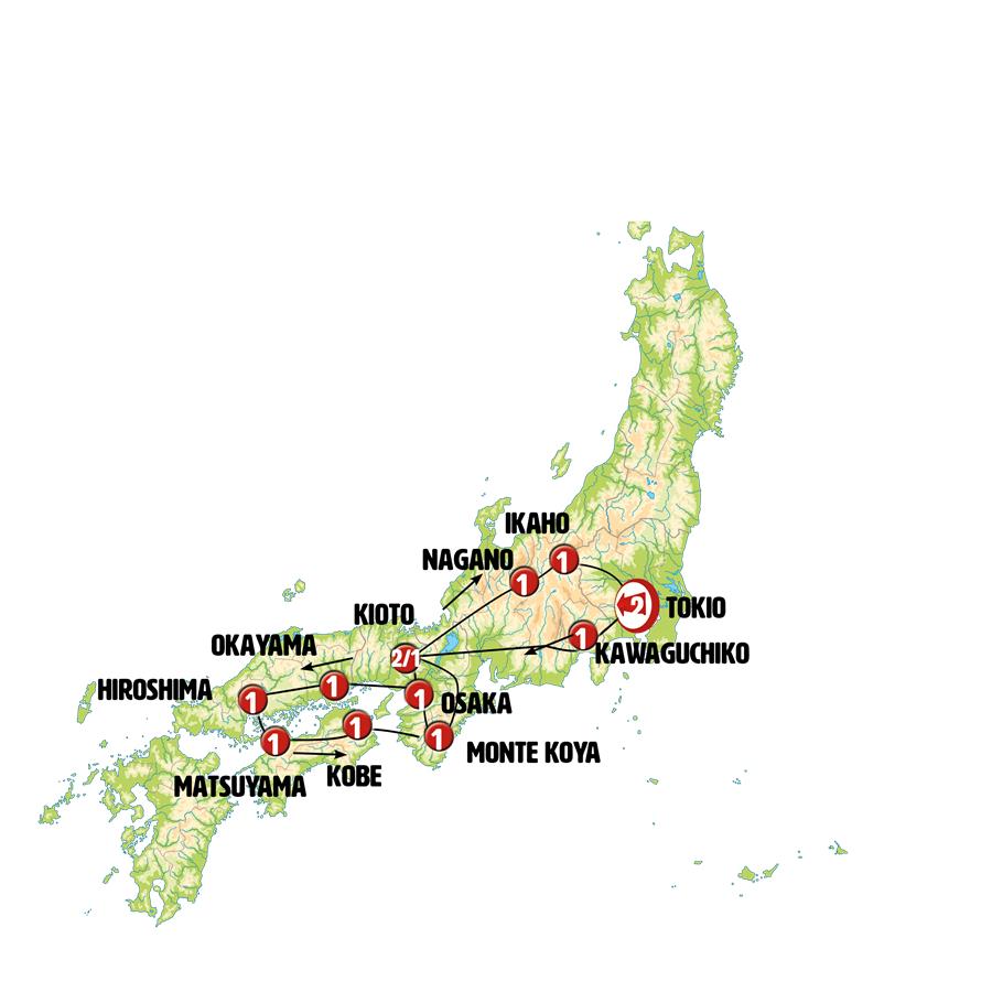 Disfruta de un recorrido grupal en autobús con guía en español durante 16 días, visitando 27 ciudades. Incluye alojamiento en hoteles y desayunos diarios. Turismo guiado por TOKIO, MONTE FUJI, KAWAGUCHIKO, IYASHI-NO-SATO NENBA, TOYOTA, KIOTO, NARA, OSAKA, HIMEJI, JARDINES DE KORAKUEN, OKAYAMA, KURASHIKI, ITSUKUSHIMA, HIROSHIMA, MATSUYAMA, KOTOHIRA, TAKAMATSU, NARUTO, KOBE, MONTE KOYA, TSUMAGO, MATSUMOTO, NAGANO, PARQUE DE LOS MONOS, KUSATSU, IKAHO, NIKKO.