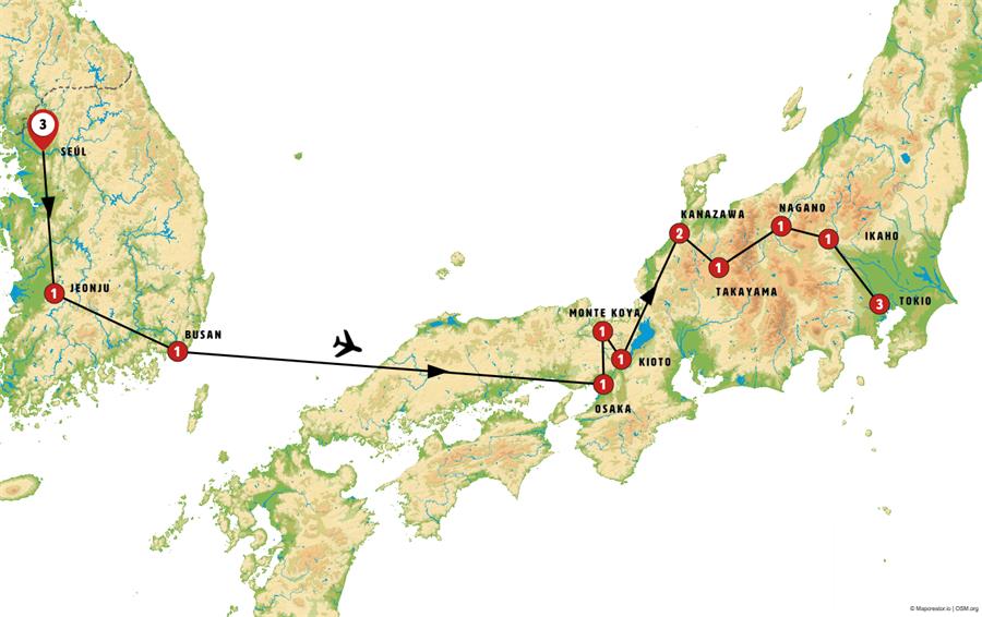 SEÚL, SUWON, JEONJU, DAMYANG, HAEINSA, BUSAN, OSAKA, MONTE KOYA, KIOTO, EIHEI-JI, KATSUYAMA-MUSEO DE LOS DINOSAURIOS, KATSUYAMA, KANAZAWA, AINOKURA, SHIRAKAWAGO, ALDEA DE HIDA, TAKAYAMA, HIDA FURUKAWA, MATSUMOTO, NAGANO, PARQUE DE LOS MONOS, KUSATSU, IKAHO, NIKKO, TOKIO, MONTE FUJI, KAWAGUCHIKO
