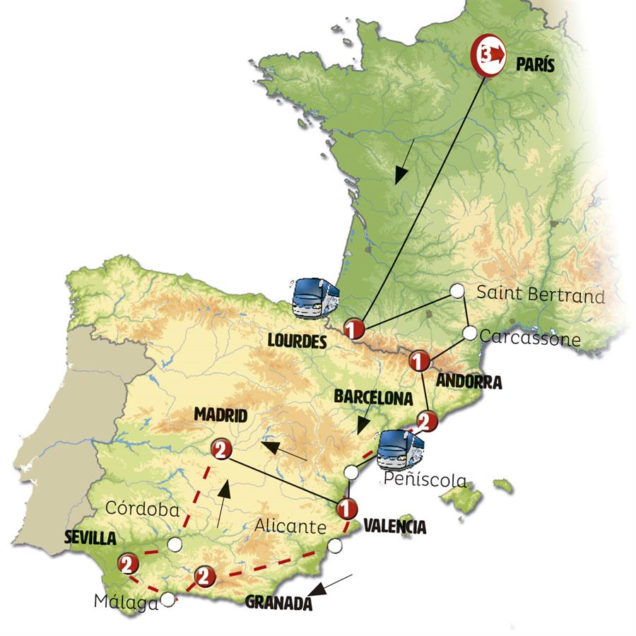 Disfruta de un recorrido grupal en autobús con guía en español durante 14 días, visitando 21 ciudades. Incluye alojamiento en hoteles y desayunos diarios. Turismo guiado por PARÍS, TOURS, BURDEOS, LOURDES, CARCASONA, FOIX, ANDORRA, MONTSERRAT, BARCELONA, PEÑÍSCOLA, VALENCIA, ALICANTE, GUADIX, GRANADA, NERJA, MÁLAGA, RONDA, SEVILLA, CÓRDOBA, CONSUEGRA, MADRID.