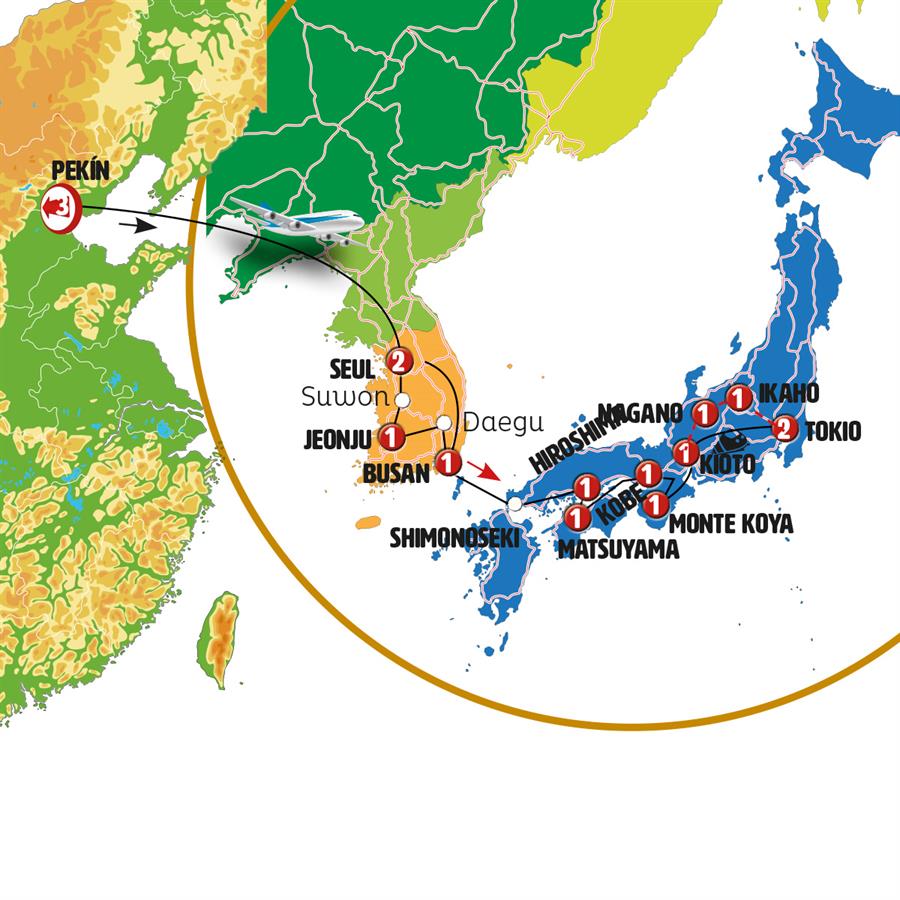 Disfruta de un recorrido grupal en autobús con guía en español durante 18 días, visitando 27 ciudades. Incluye alojamiento en hoteles y desayunos diarios. Turismo guiado por PEKÍN, SEÚL, SUWON, JEONJU, DAMYANG, HAEINSA, BUSAN, FUKUOKA, IWAKUNI, ITSUKUSHIMA, HIROSHIMA, MATSUYAMA, KOTOHIRA, TAKAMATSU, NARUTO, KOBE, OSAKA, MONTE KOYA, KIOTO, TSUMAGO, MATSUMOTO, NAGANO, PARQUE DE LOS MONOS, KUSATSU, IKAHO, NIKKO, TOKIO.