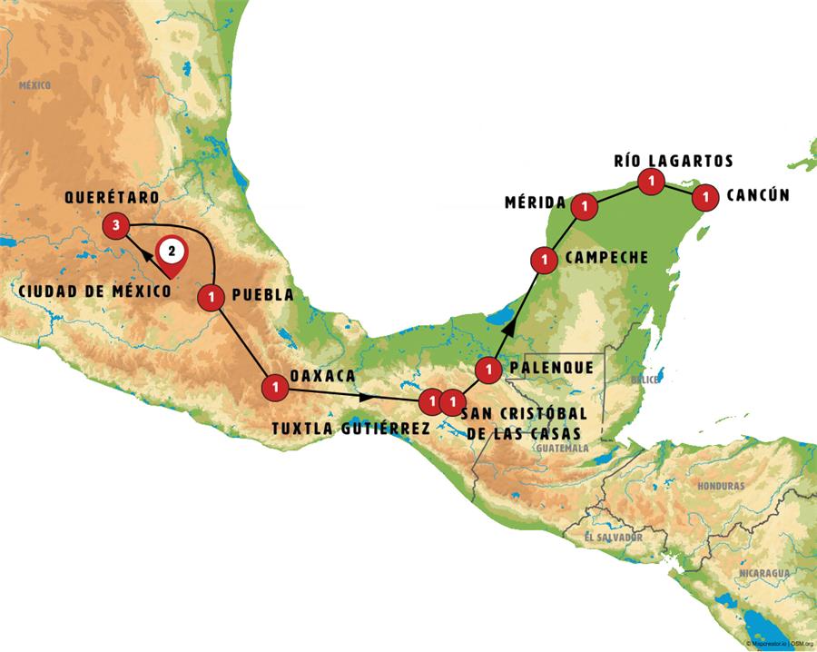 Disfruta de un recorrido grupal en autobús con guía en español durante 15 días, visitando 22 ciudades. Incluye alojamiento en hoteles y desayunos diarios. Turismo guiado por CIUDAD DE MÉXICO, QUERÉTARO, TULA, PUEBLA, OAXACA, SAN PABLO VILLA DE MITLA, TUXTLA GUTIÉRREZ, CAÑÓN DEL SUMIDERO, CHIAPA DE CORZO, ZINACANTÁN, SAN JUAN DE CHAMULA, SAN CRISTÓBAL DE LAS CASAS, AGUA AZUL, MISOL HA, PALENQUE, CAMPECHE, MÉRIDA, IZAMAL, CHICHÉN ITZÁ, RÍO LAGARTOS, CENOTE CHOJ HA, CANCÚN.