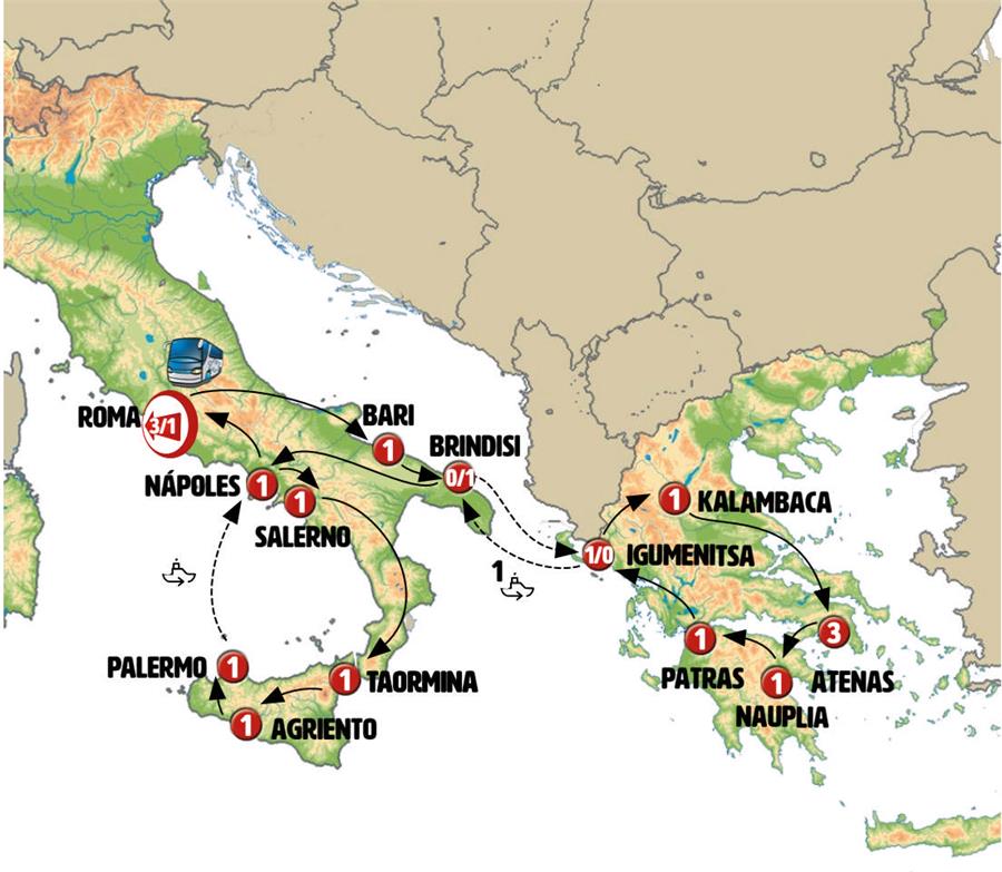 Disfruta de un recorrido grupal en autobús con guía en español durante 21 días, visitando 38 ciudades. Incluye alojamiento en hoteles y desayunos diarios. Turismo guiado por ROMA, ABADIA SAN GIOVANNI IN VENERE, TÉRMOLI, BARI, BRÍNDISI, FERRI BRINDISI - IGUMENITSA, IGUMENITSA, METSOVO, KALAMBAKA, DELFOS, OSIOS LOUKÁS, ATENAS, CORINTO, POROS, EPIDAURO, NAUPLIA, TRÍPOLI, OLIMPIA, PATRAS, FERRI IGUMENITSA - BRINDISI, ALBEROBELLO, MATERA, NÁPOLES, CAPRI, SORRENTO, SALERNO, PAOLA, MESINA, TAORMINA, CATANIA, SIRACUSA, AGRIGENTO, MARSALA, ERICE, PALERMO, MONREALE, FERRI PALERMO - NÁPOLES, POMPEYA.