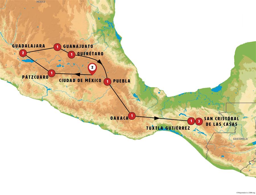 Disfruta de un recorrido grupal en autobús con guía en español durante 14 días, visitando 21 ciudades. Incluye alojamiento en hoteles y desayunos diarios. Turismo guiado por CIUDAD DE MÉXICO, MINA DE LAS DOS ESTRELLAS, TLALPUJAHUA, PÁTZCUARO, MORELIA, TLAQUEPAQUE, GUADALAJARA, GUANAJUATO, DOLORES HIDALGO, SAN MIGUEL DE ALLENDE, QUERÉTARO, TULA, PUEBLA, OAXACA, SAN PABLO VILLA DE MITLA, TUXTLA GUTIÉRREZ, CAÑÓN DEL SUMIDERO, CHIAPA DE CORZO, ZINACANTÁN, SAN JUAN DE CHAMULA, SAN CRISTÓBAL DE LAS CASAS.