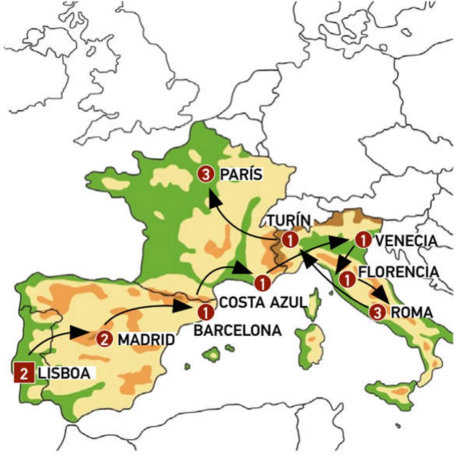 Disfruta de un recorrido grupal en autobús con guía en español durante 16 días, visitando 15 ciudades. Incluye alojamiento en hoteles y desayunos diarios. Turismo guiado por LISBOA, CÁCERES, MADRID, ZARAGOZA, BARCELONA, COSTA AZUL, MÓNACO, GÉNOVA, VENECIA, FLORENCIA, ROMA, PISA, TURÍN, GINEBRA, PARÍS.