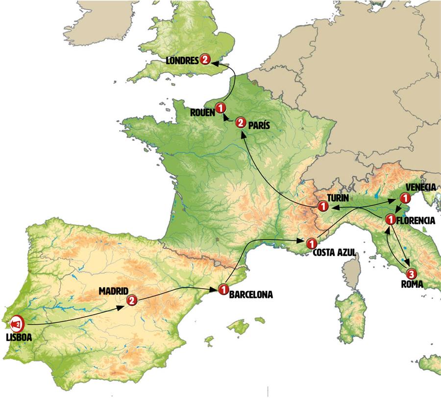 LISBOA, CÁCERES, MADRID, ZARAGOZA, BARCELONA, COSTA AZUL, MÓNACO, GÉNOVA, VENECIA, FLORENCIA, ROMA, PISA, TURÍN, GINEBRA, PARÍS, ROUEN, CANAL DE LA MANCHA, CANTERBURY, LONDRES