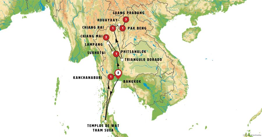 Disfruta de un recorrido grupal en autobús con guía en español durante 12 días, visitando 13 ciudades. Incluye alojamiento en hoteles y desayunos diarios. Turismo guiado por BANGKOK, TEMPLOS DE WAT THAM SUEA, KANCHANABURI, AYUTTHAYA, PHITSANULOK, SUKHOTAI, LAMPANG, CHIANG MAI, TRIANGULO DORADO, CHIANG RAI, HOUAYXAY, PAK BENG, LUANG PRABANG.
