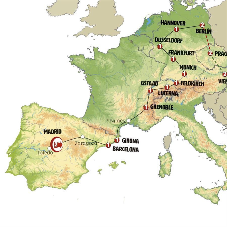 Disfruta de un recorrido grupal en autobús con guía en español durante 19 días, visitando 33 ciudades. Incluye alojamiento en hoteles y desayunos diarios. Turismo guiado por MADRID, ZARAGOZA, POBLET, BARCELONA, GERONA, CARRIÈRES DE LUMIÈRES, CHAMBERY, GINEBRA, GRUYERES, LEYSIN, INTERLAKEN, LUCERNA, EINSIEDELN, VADUZ, FELDKIRCH, LAGO DE CONSTANZA, LINDAU, MÚNICH, FUSSEN, ROTEMBURGO, FRANKFURT, CRUCERO POR EL RIN, COLONIA, DORTMUND, RUTA DE LOS CUENTOS DE HADAS, HANNOVER, GOSLAR, BERLÍN, DRESDE, PRAGA, CESKÉ BUDEJOVICE, CESKY KRUMLOV, VIENA.