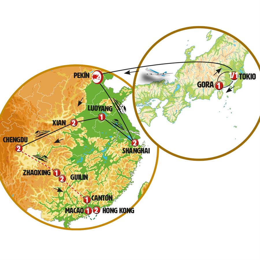 TOKIO, KAMAKURA, ENOSHIMA, ODAWARA, MONTE FUJI, KAWAGUCHIKO, PEKÍN, SHANGHÁI, LUOYANG, LONGMEN, SANMENXIA, XIAN, CHENGDU, PUEBLO MIAO, ZHAOXING, GUANGXIAO, CHENGYANG, LONGSHENG, GUILIN, CRUCERO POR EL RÍO LI, YANGSHUO, HUANGYAO, CANTON, ZHUHAI, MACAO