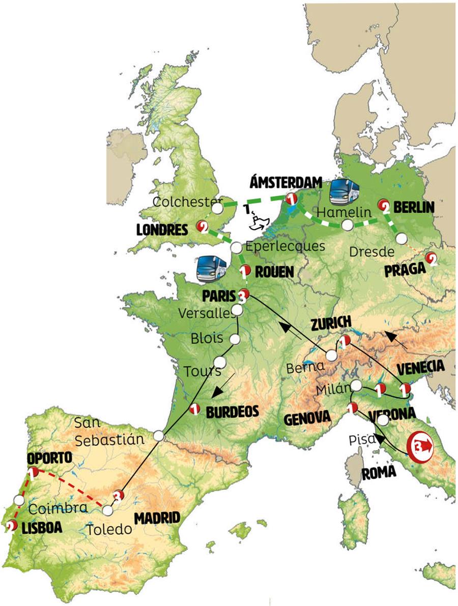 Disfruta de un recorrido grupal en autobús con guía en español durante 19 días, visitando 26 ciudades. Incluye alojamiento en hoteles y desayunos diarios. Turismo guiado por ROMA, PISA, SANTA MARGHERITA LIGURE, PORTOFINO, GÉNOVA, SAN GIULIO, MILÁN, VERONA, VENECIA, LUGANO, LUCERNA, ZÚRICH, ESTRASBURGO, PARÍS, ROUEN, CANAL DE LA MANCHA, CANTERBURY, LONDRES, COLCHESTER, FERRI COLCHESTER - VOLENDAM, VOLENDAM, ÁMSTERDAM, HAMELIN, BERLÍN, DRESDE, PRAGA.